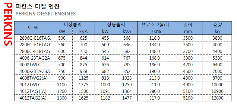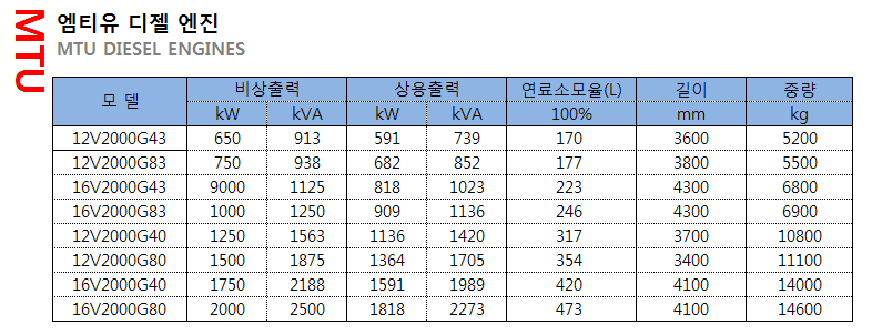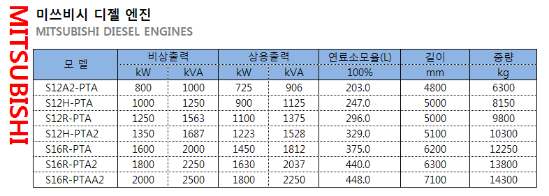 MTU, 퍼킨스, 미쓰비시 발전기 모델별 연료 소모량